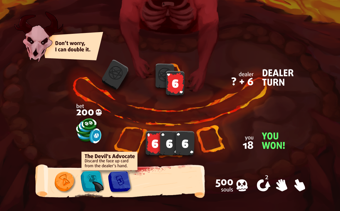 Each time you lose, you’re hurled back to the beginning—caught in a loop, cursed to play again and again. Yet something's different: you keep your memories. Learn from each loop, remember the Devil’s tells, and make smarter choices. With each soul you win (or lose), you can unlock infernal powers—see the Devil’s cards, manipulate the deck, and more.